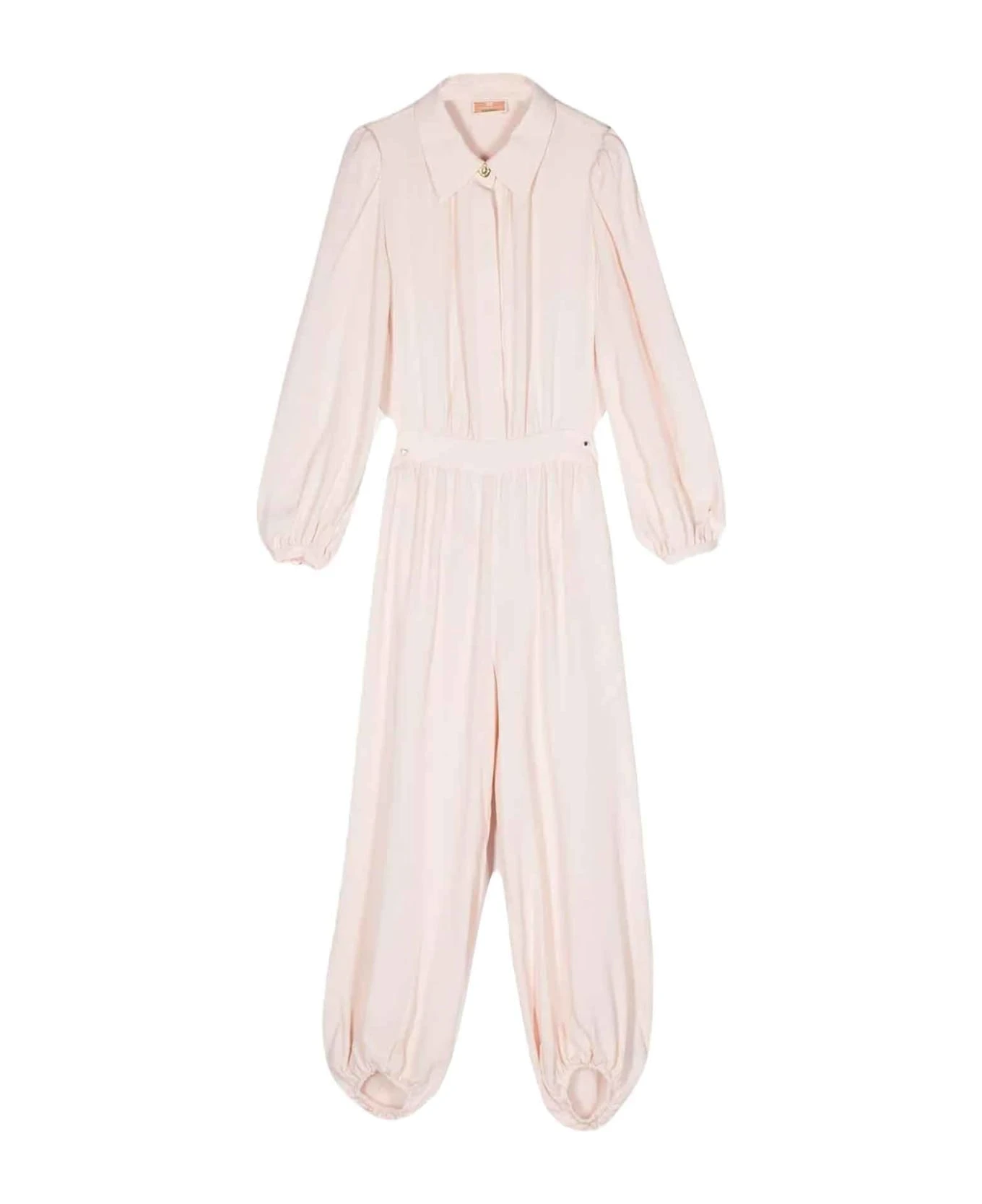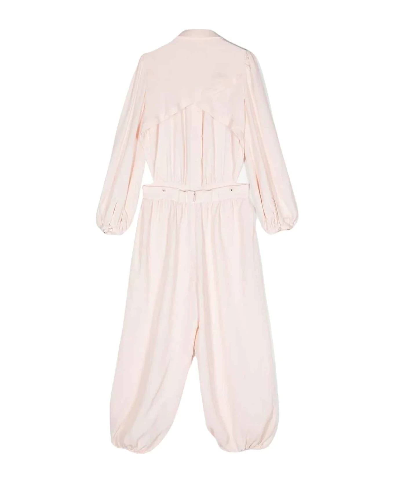 Beige jumpsuit girl. Featuring a classic collar, long sleeves, a concealed front button fastening, an open back, ruching detail, a concealed back zip fastening and an elasticated hem. viscose 100%