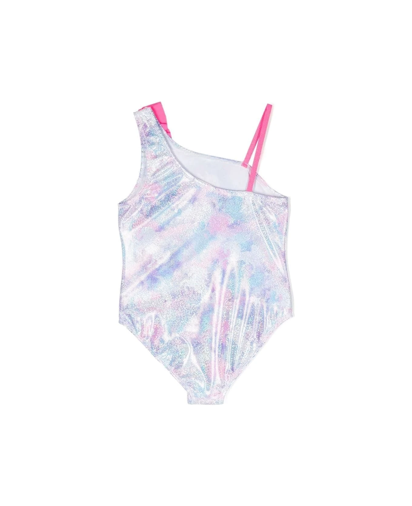 Costume multicolor intero. È decorato con rouches fucsia laterale a contrasto e unicorni all-over.