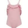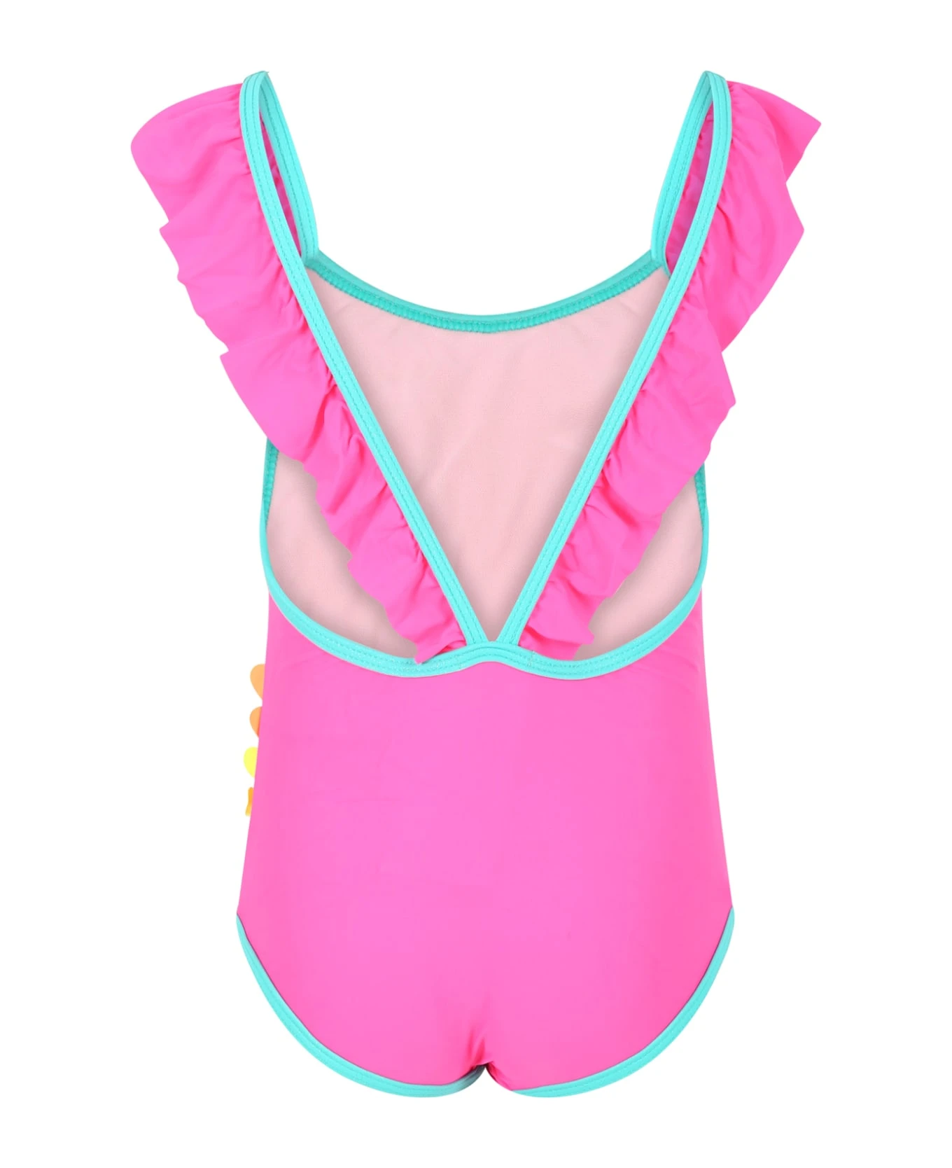 Fuchsia one-piece swimsuit, braces with ruches. It is embellished with hearts patch and lurex details on the front.