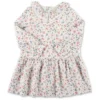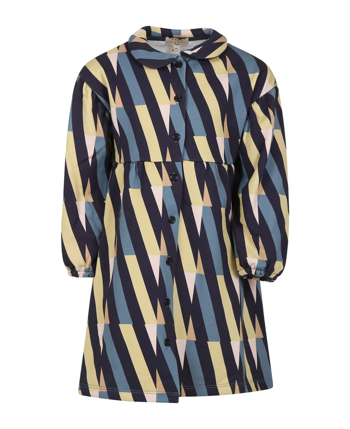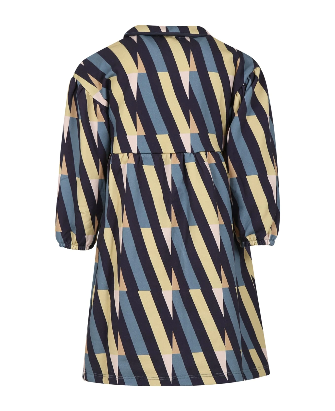 Blue dress in organic cotton fleece, long sleeves, with collar, front button closure and elasticated cuffs. It is embellished with all-over abstract lines print.