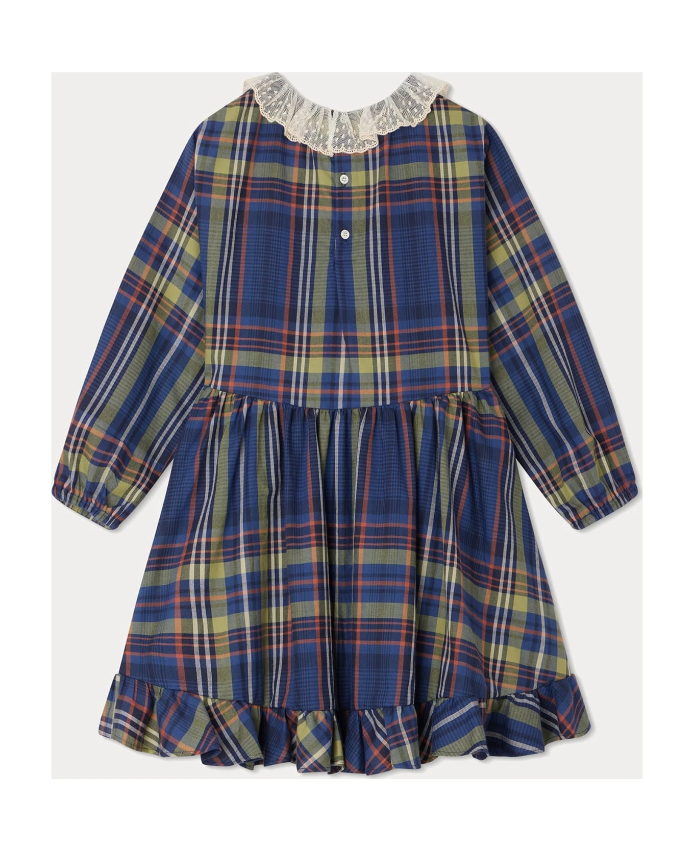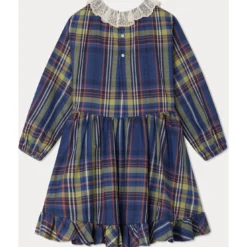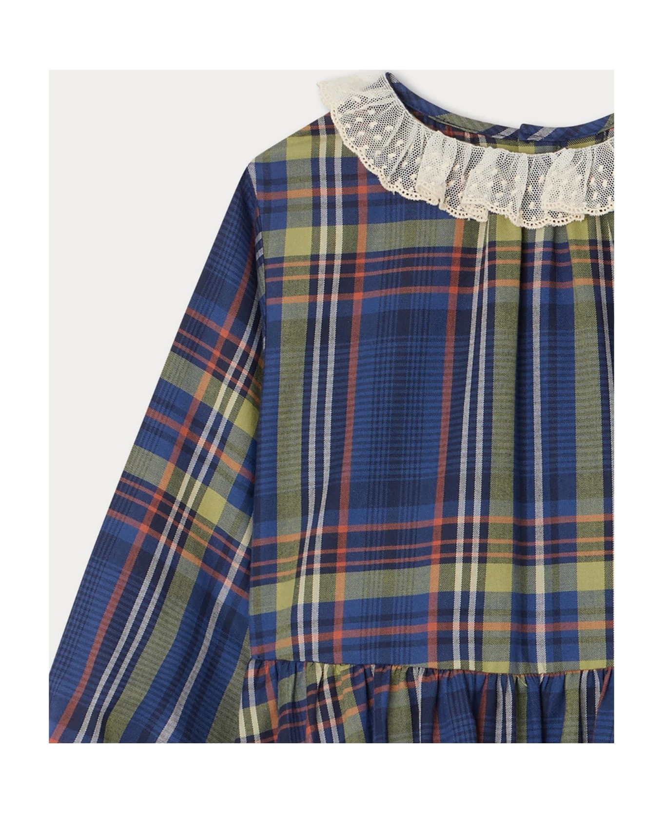 Cotton dress, check print, round neckline with lace, long sleeves, button closure on the back