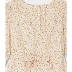 Cotton dress, round neckline, all-over print, long sleeves, button closure on the back, bow at the waist