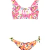 White swimsuit, with adjustable straps. It is embellished with ruffles on the top and around the legs, with all-over multicolor cherry print and logo on the front.