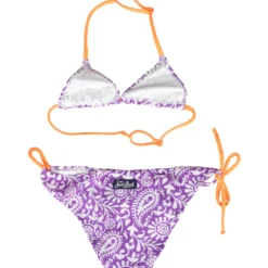 White swimsuit, with adjustable straps. It is embellished with ruffles on the top and around the legs, with all-over multicolor cherry print and logo on the front.