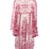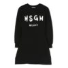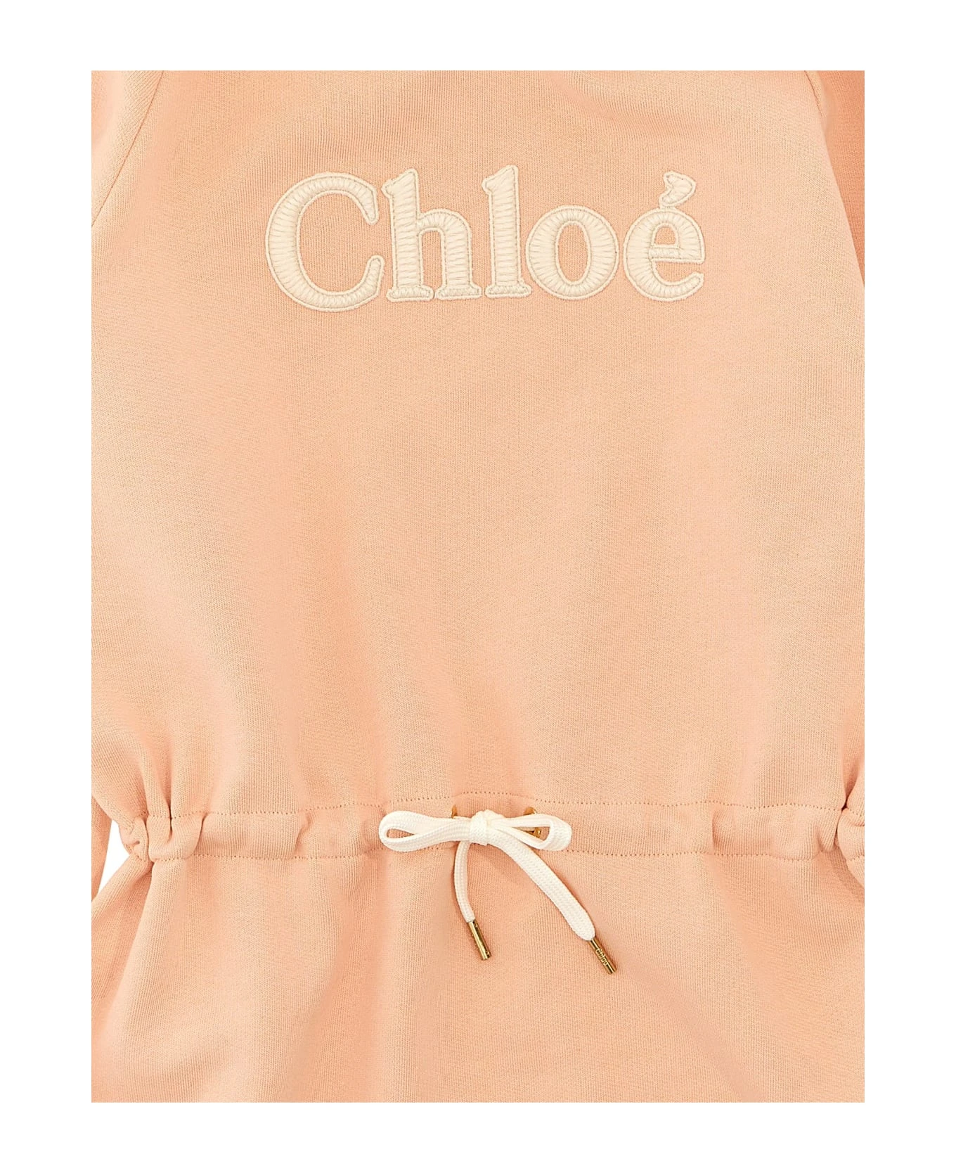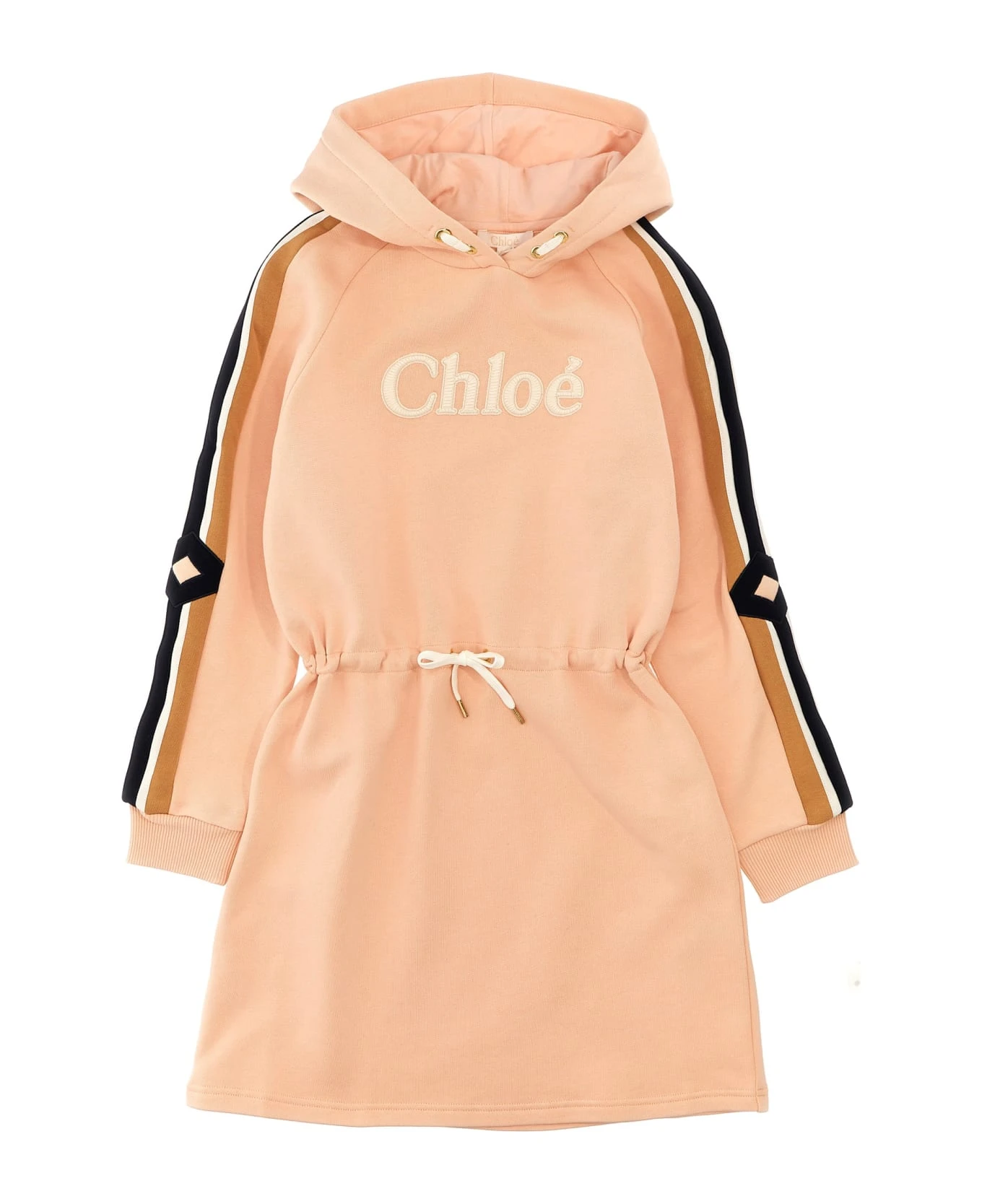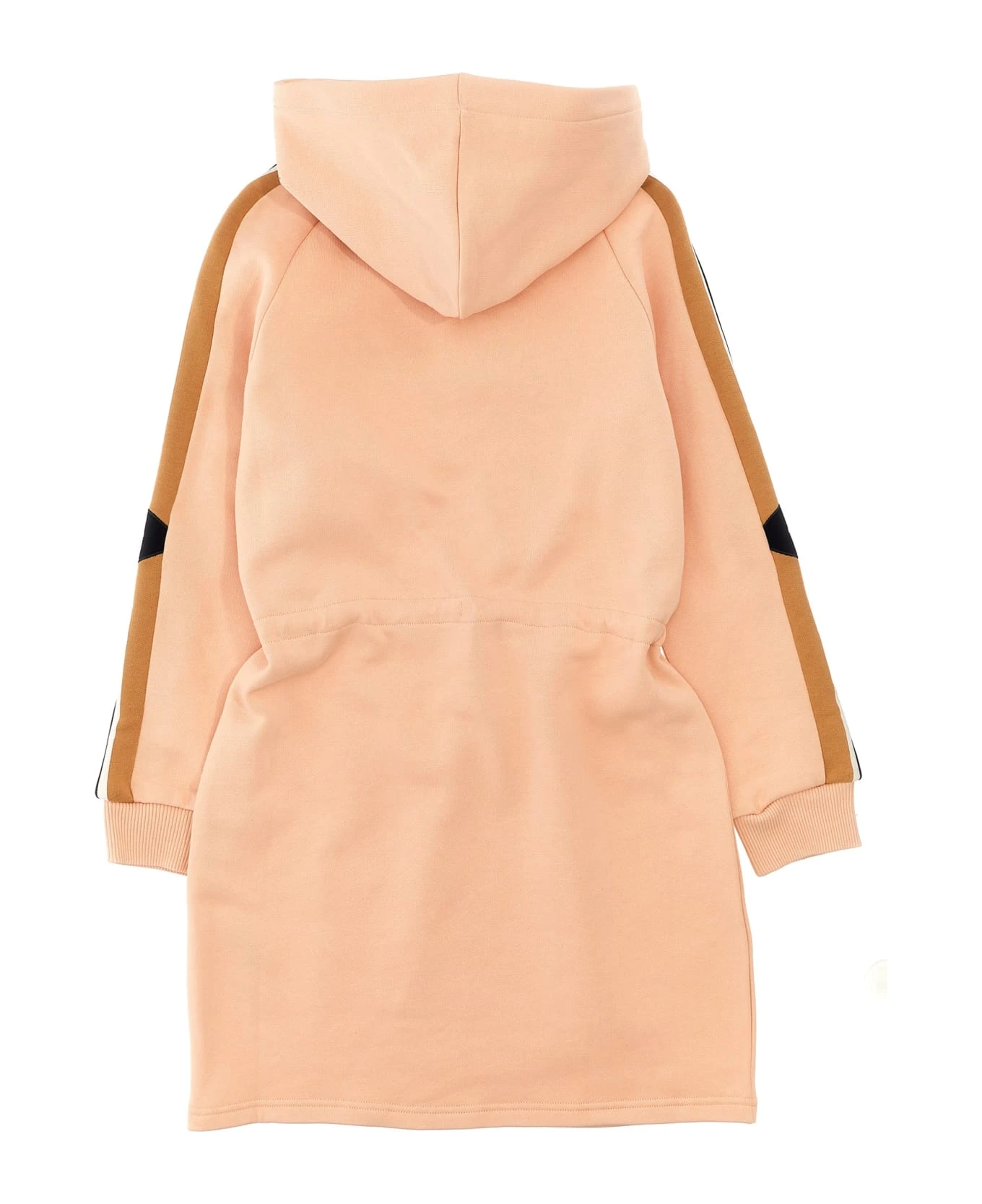 Cotton hooded dress with front embroidered logo, contrasting bands on sleeves, adjustable drawstring at the waist, and long cuffed sleeves.
