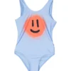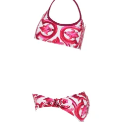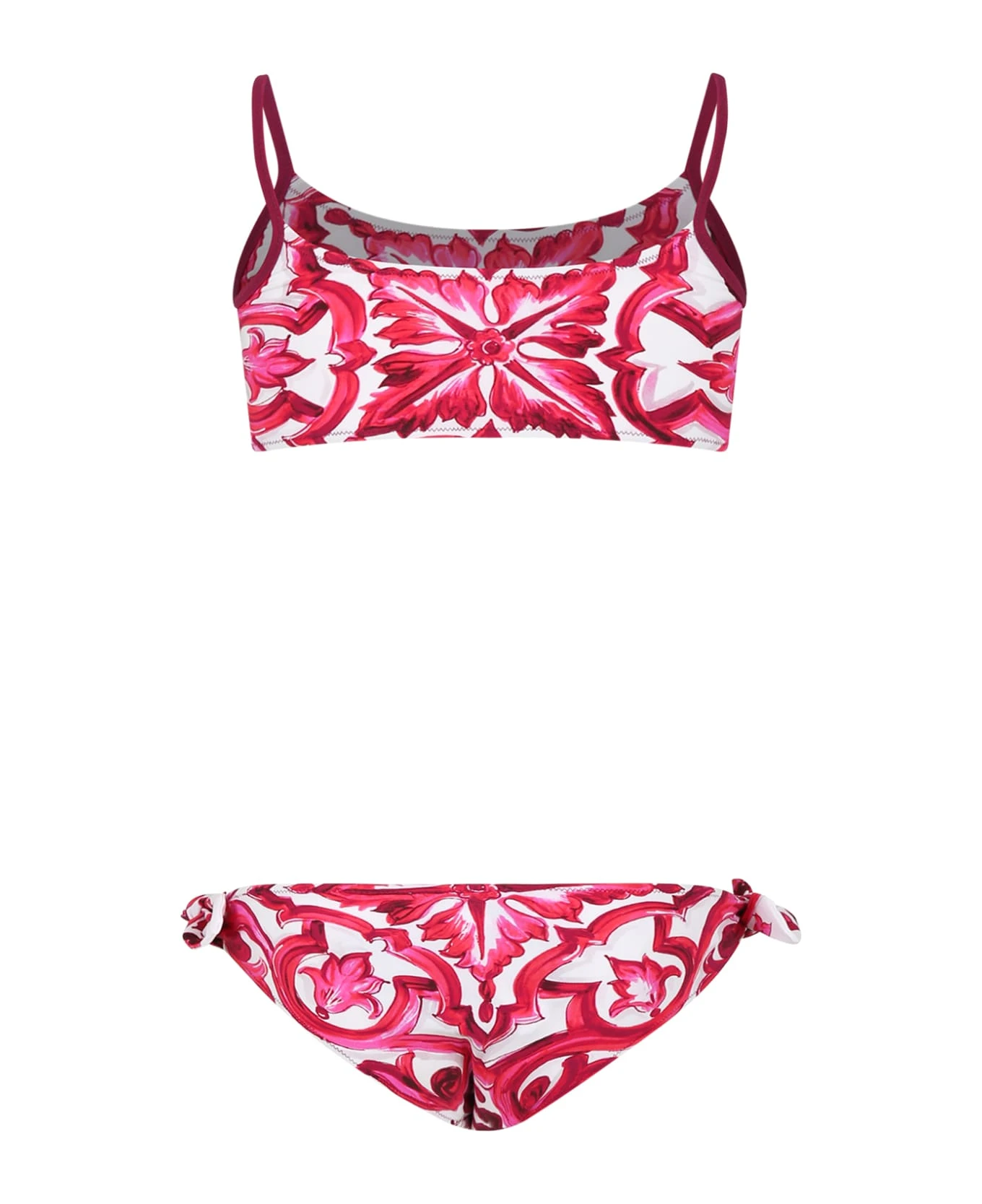 White bikini, top with straps and swim briefs with adjustable side closure. It is embellished with iconic fuchsia majolica all-over and with black logo on the side.