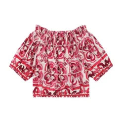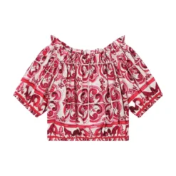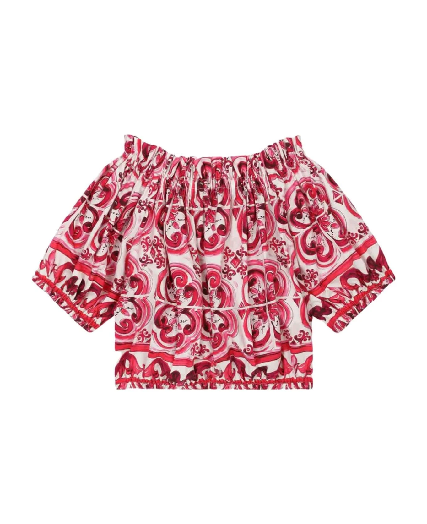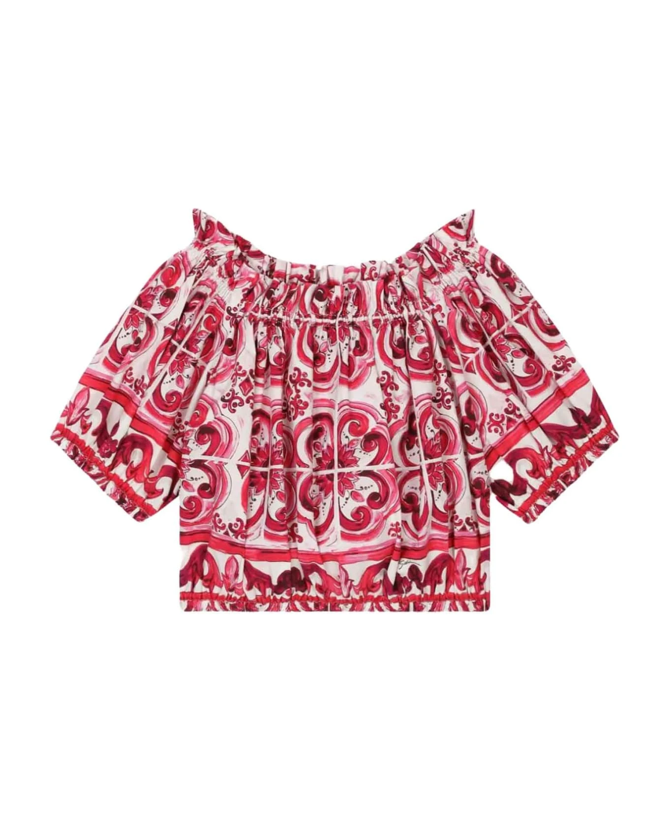 White/fuchsia blouse girl Dolce&Gabbana Kids. All over majolica print, elasticated neckline, off shoulder design, short puff sleeves and elasticated straight hem. 100% Cotton