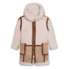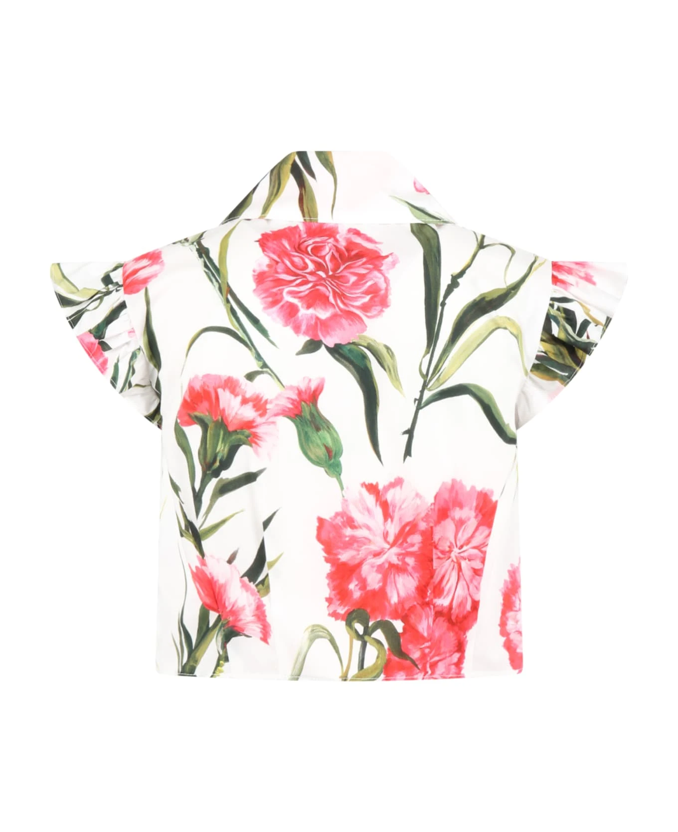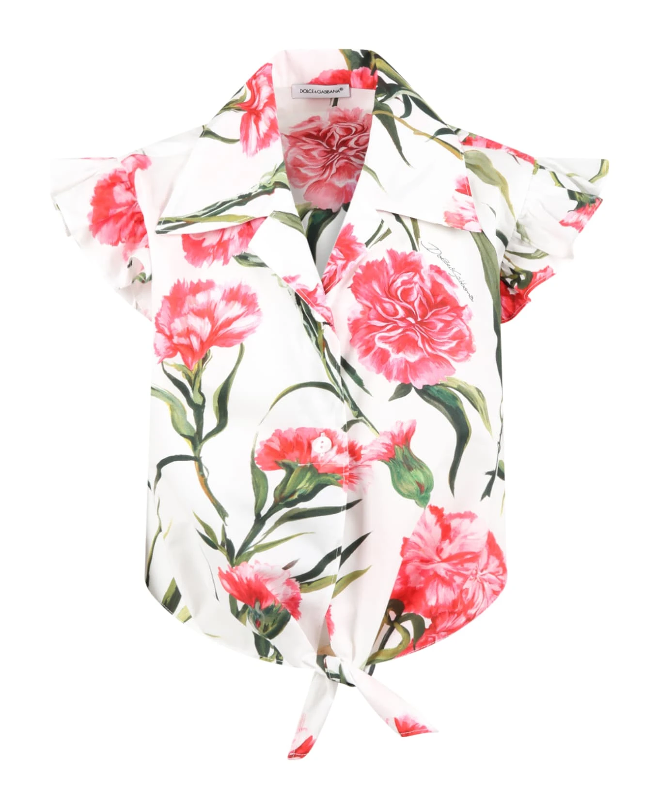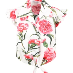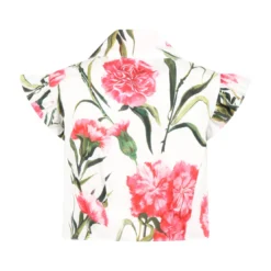 White shirt in cotton, with short sleeves with ruffles, classic collar, closure with buttons and laces on the front. It is embellished with pink carnations and all-over logo.