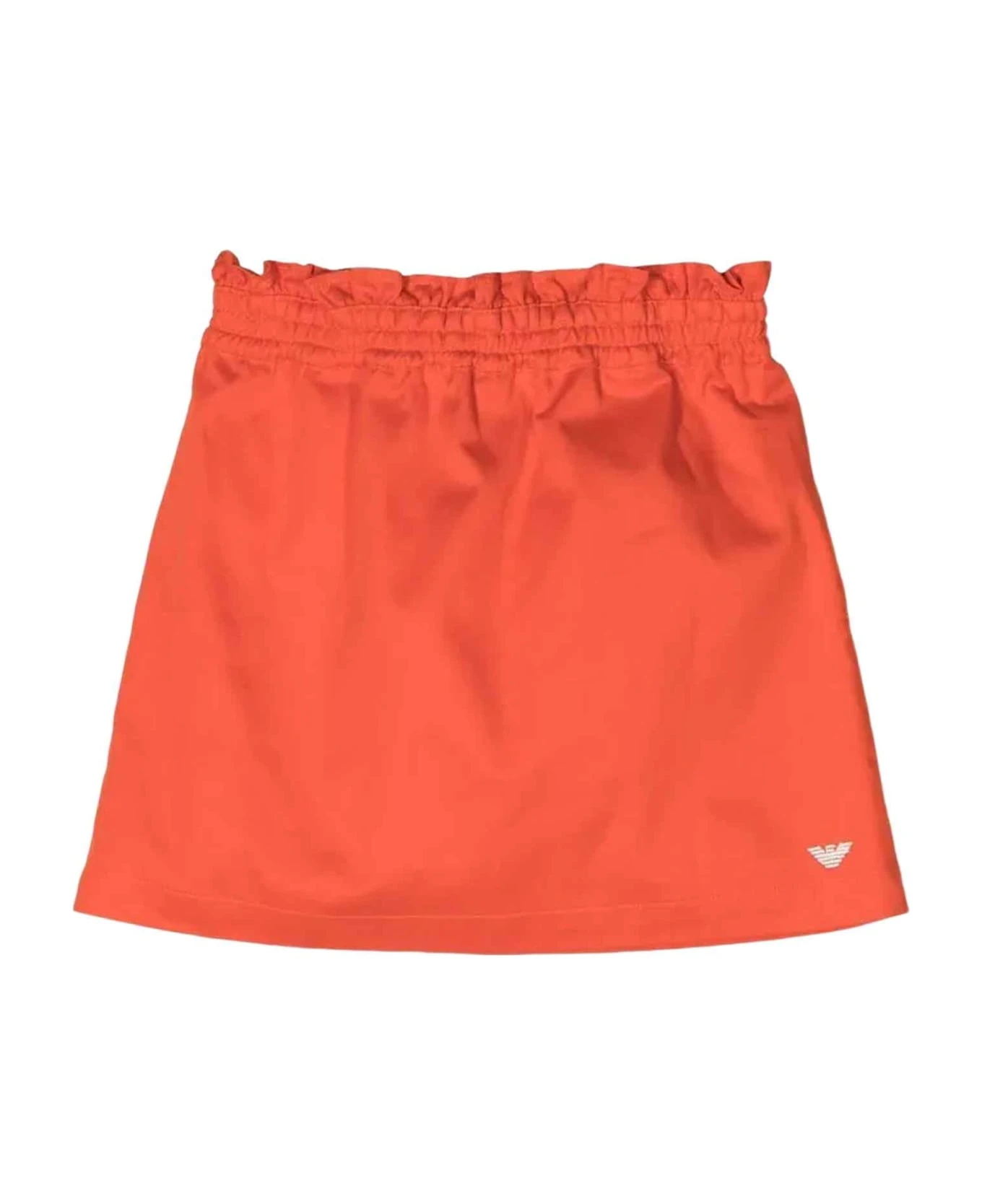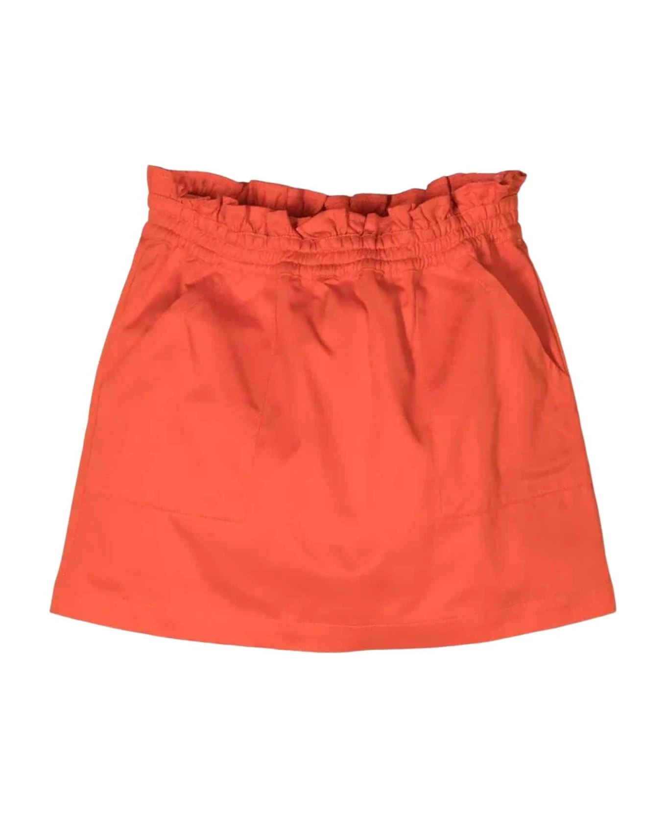 Orange skirt girl. Elasticated waist, two pockets with inserts, logo embroidered on the back and straight hem. 100% Cotton