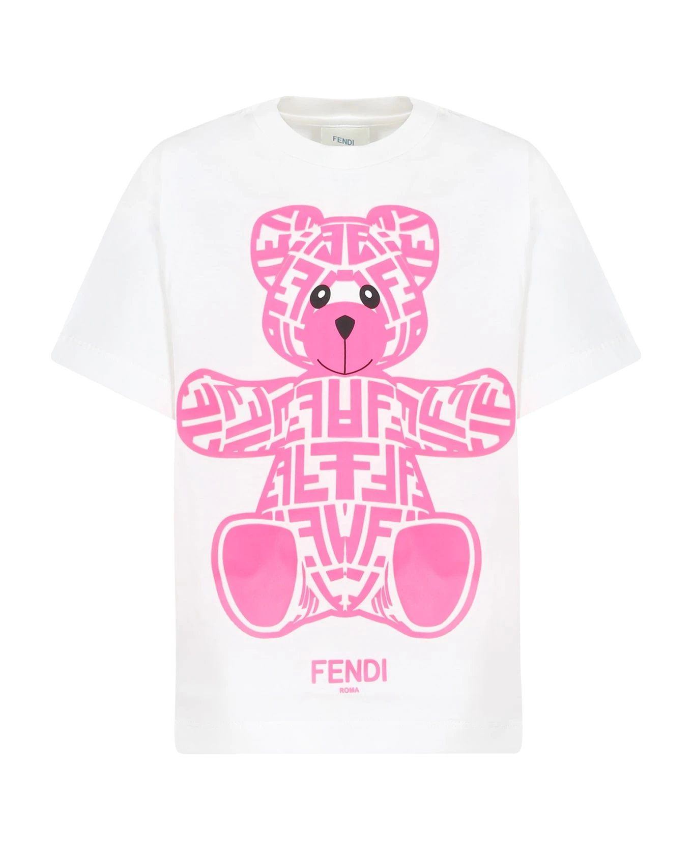 White oversize t-shirt, made from cotton jersey, with crewneck and short sleeves; it is embellished, on the front, with neon fuchsia rubbered large bear with FF and logo.