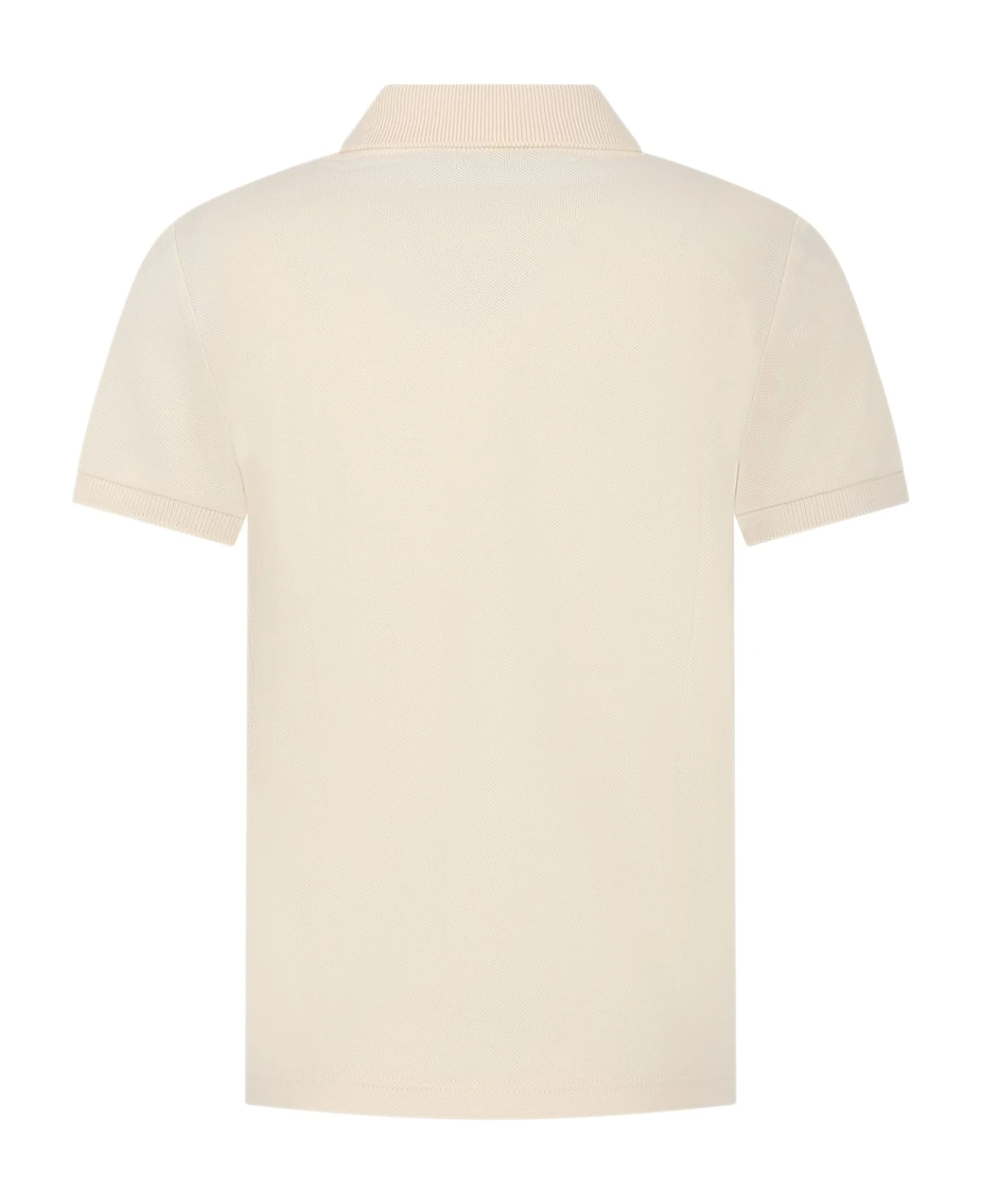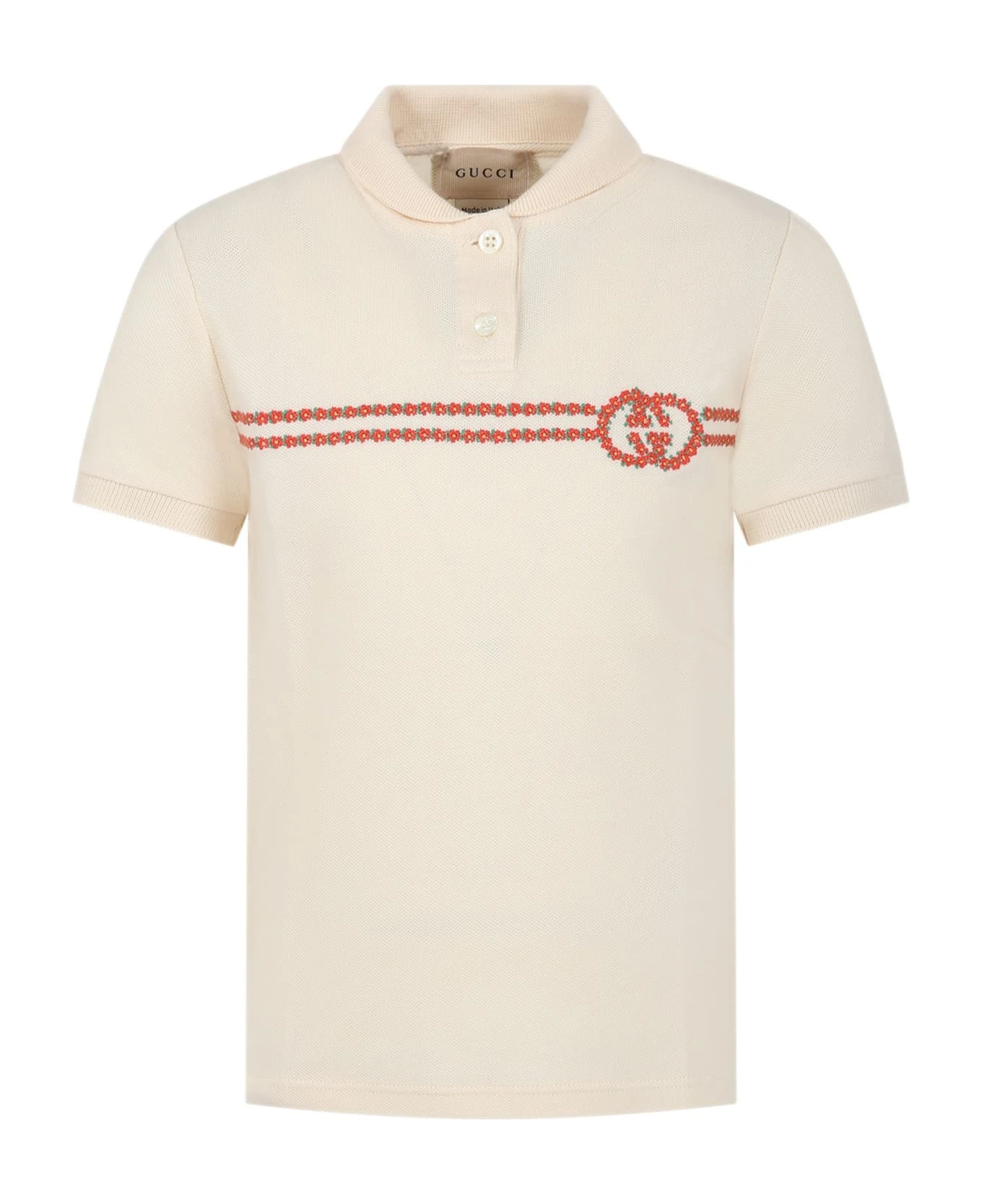 Ivory polo shirt with short sleeves, collar, front closure with buttons. It is embellished with floral pattern embroidered on the front and withdouble on the chest.