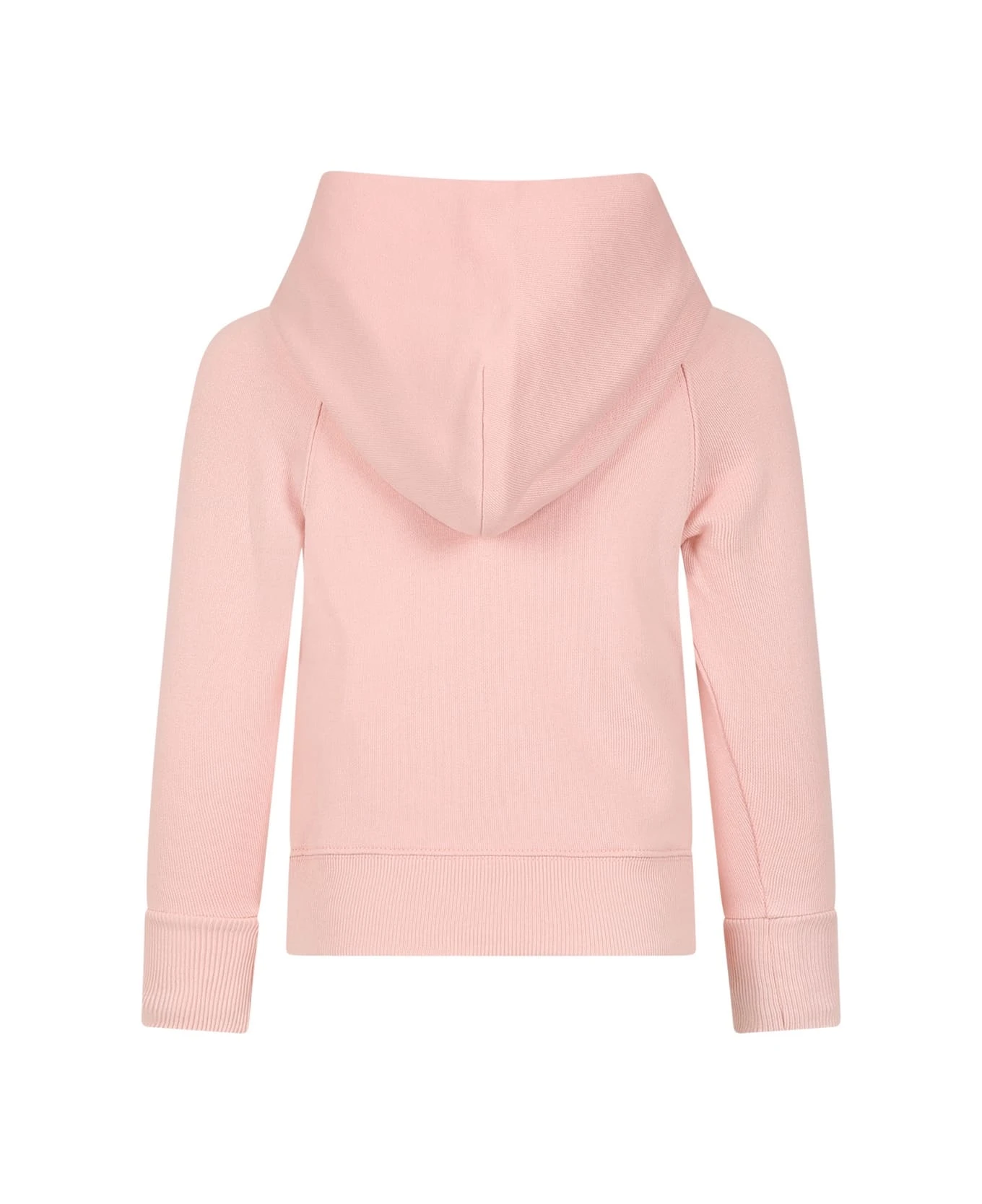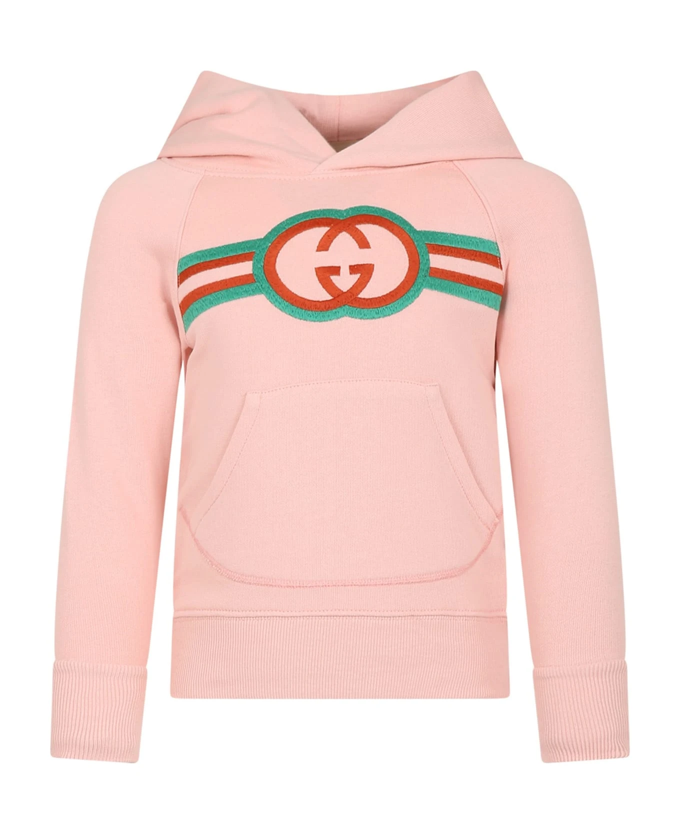 Pink sweatshirt in brushed cotton, with long sleeves, hood, ribbed cuffs and hem, front pocket. It is embellished with double G and striped motif embroidered on the front.