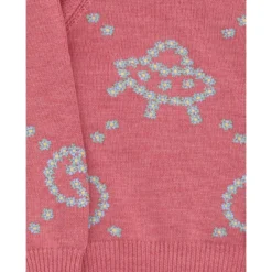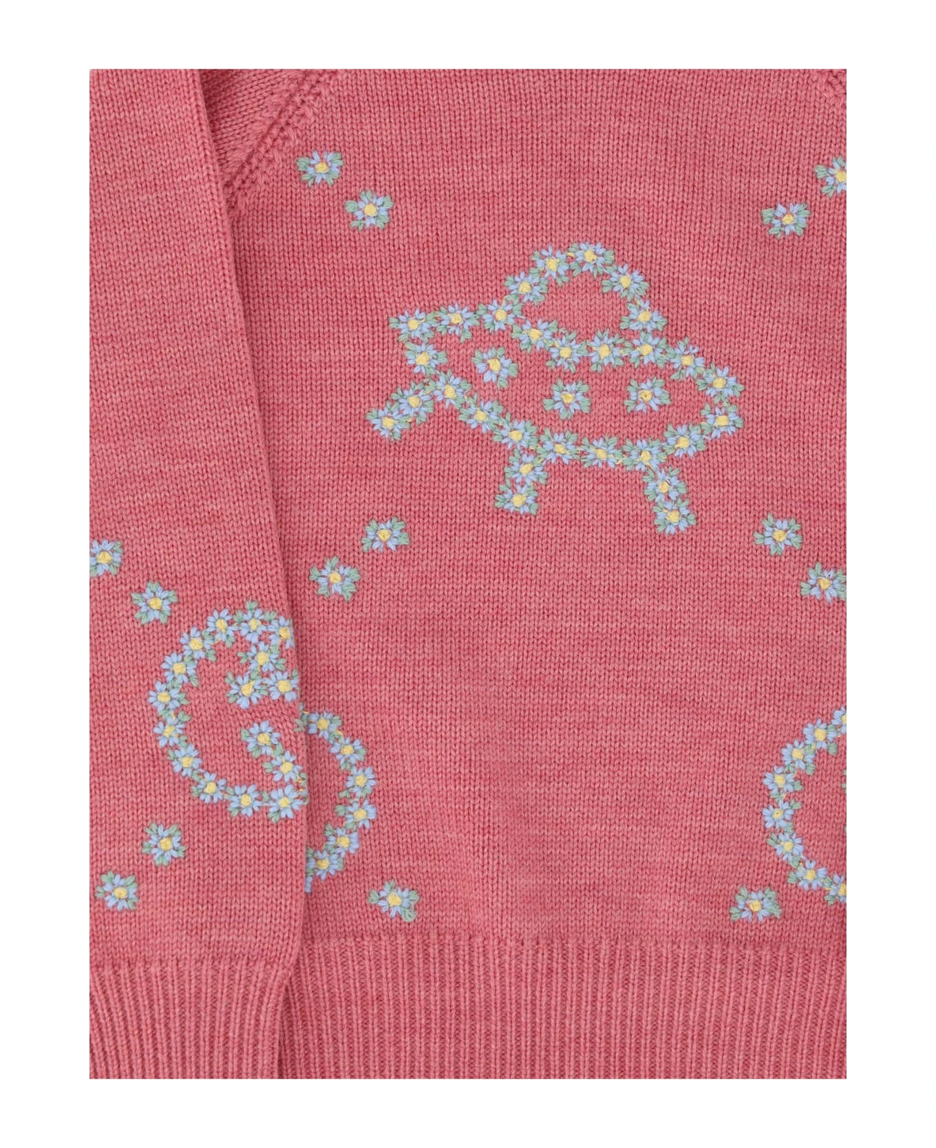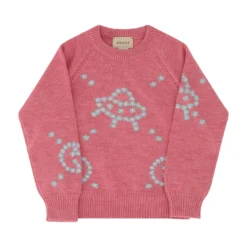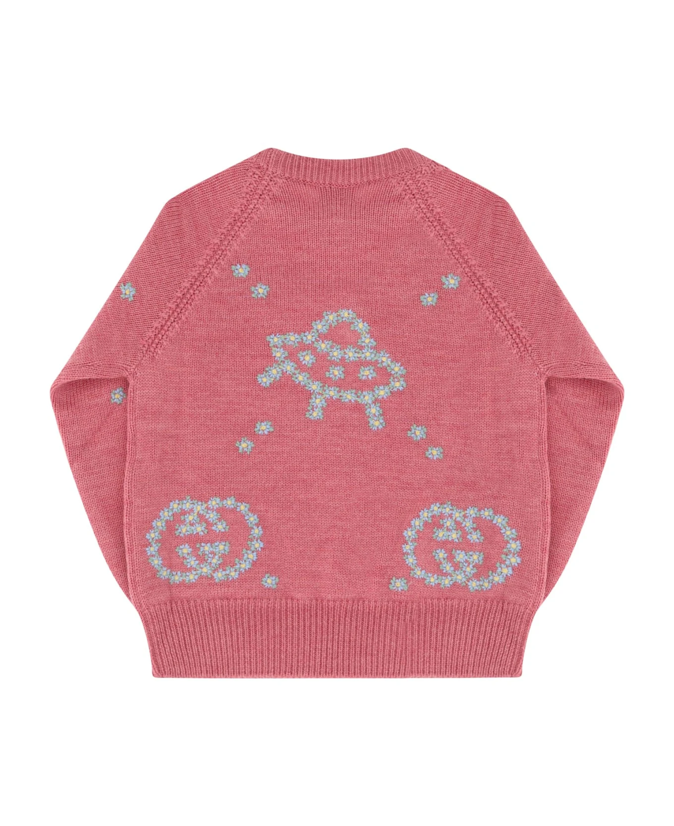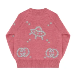 Wool sweater for girl by gucci, ribbed crew neck at front, ribbed cuffs, ribbed hem, contrasting all-over embroidered graphics and iconic brand logo.