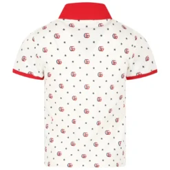 White polo shirt in stretch cotton, with short sleeves, classic red collar, ribbed hem and button closure on the front. It is embellished with Double G print and all-over stars and hearts embroidered on the collar.