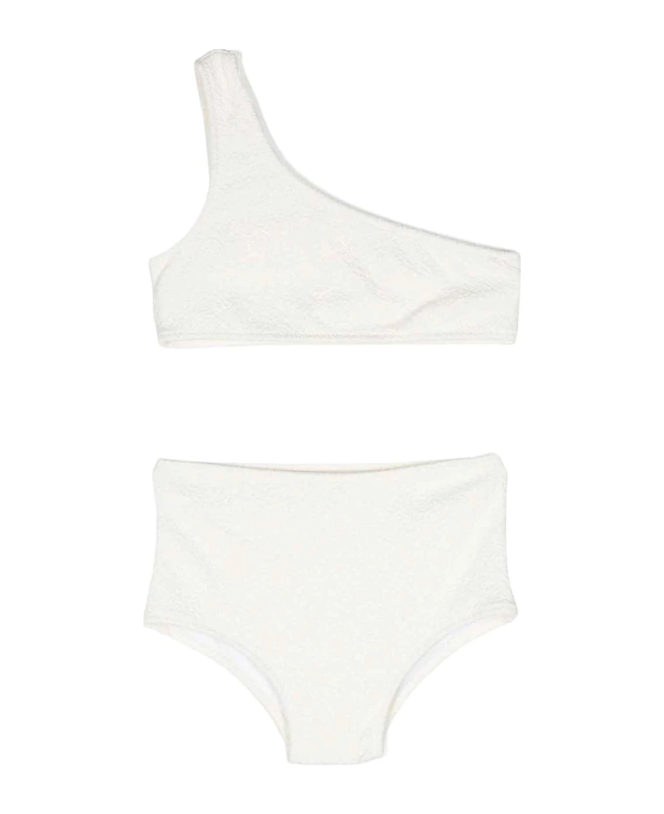 Ivory bikini girl. One-shoulder, asymmetrical and high-waisted design. Viscose 61%, Polyamide 34%, Elastane 5%
