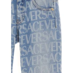 Cotton denim jeans with all-over ‘Versace on Repeat’ logo print, zip and button closure, five pockets and a leather logo tag.