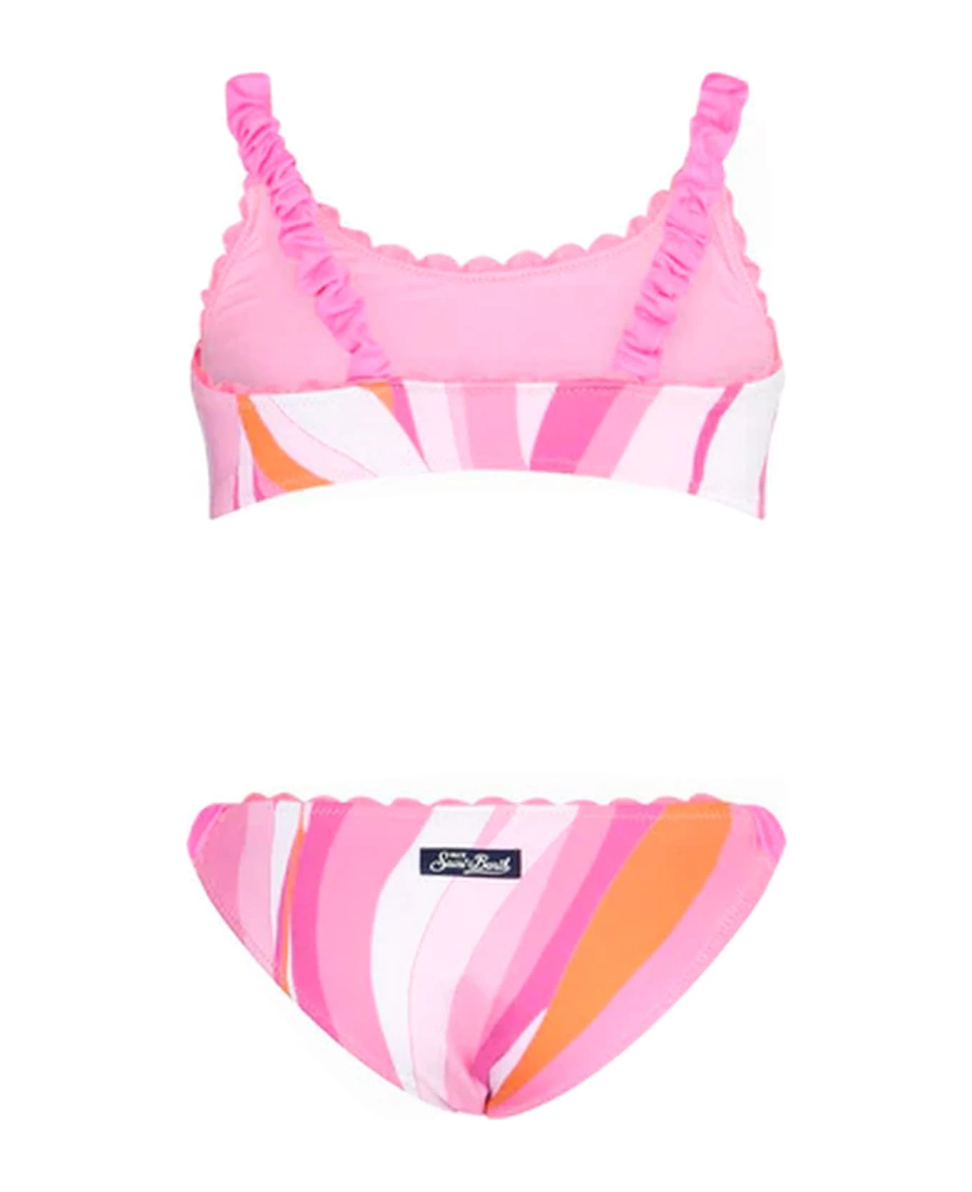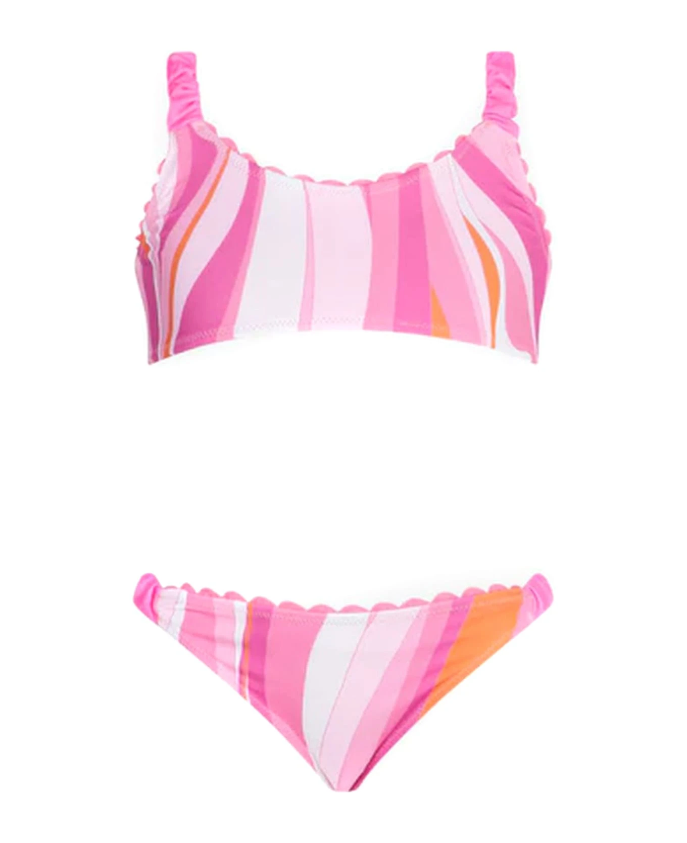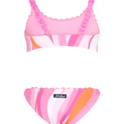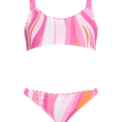 Girl bralette bikini, multicolor waves pattern with fuchsia pipings, curled shoulder straps and swim briefs sides, stretch fit, regular fit