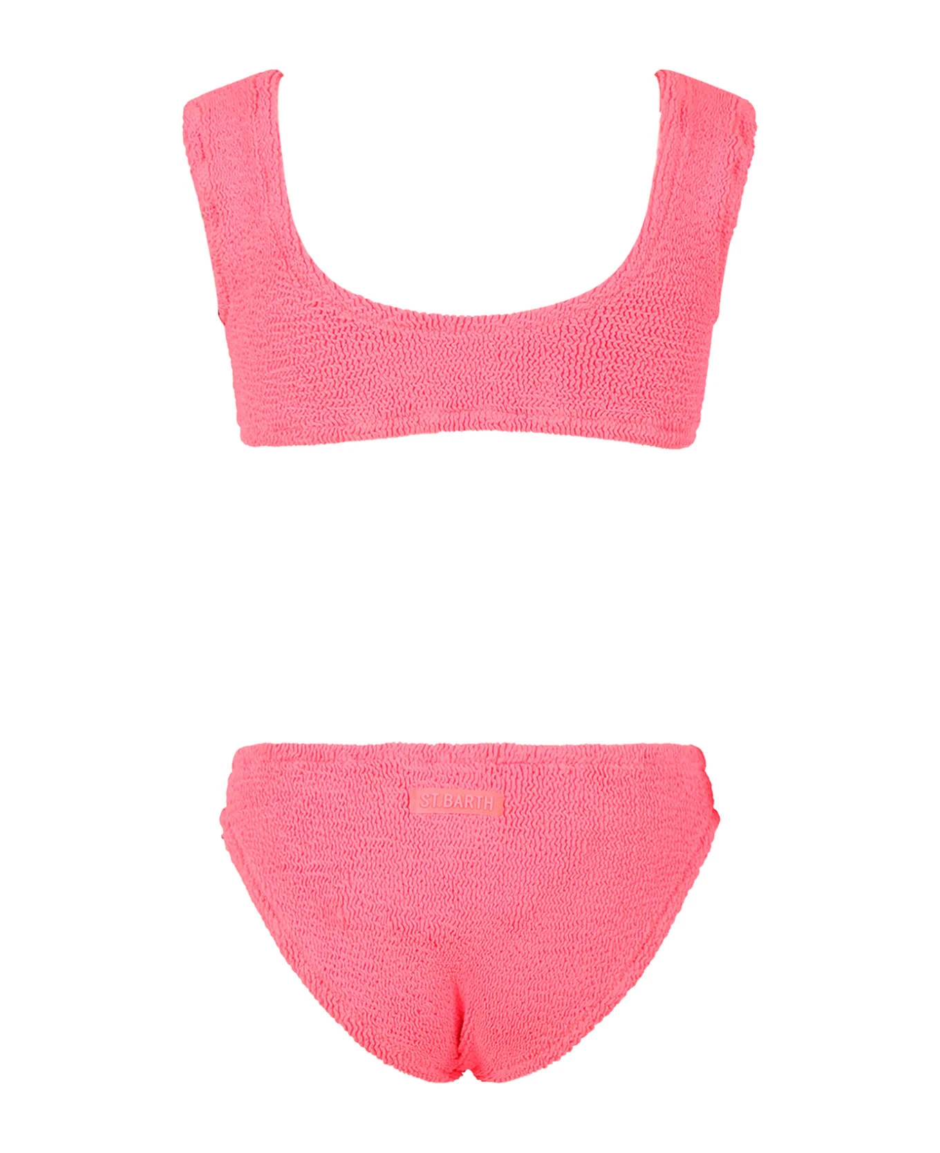 Red bikini, straps top; it is embellished with flower shaped buckle on the front and logo patch on the back.