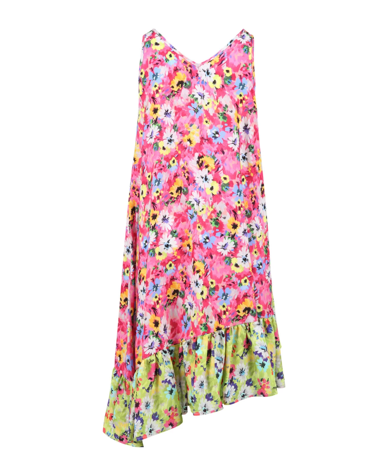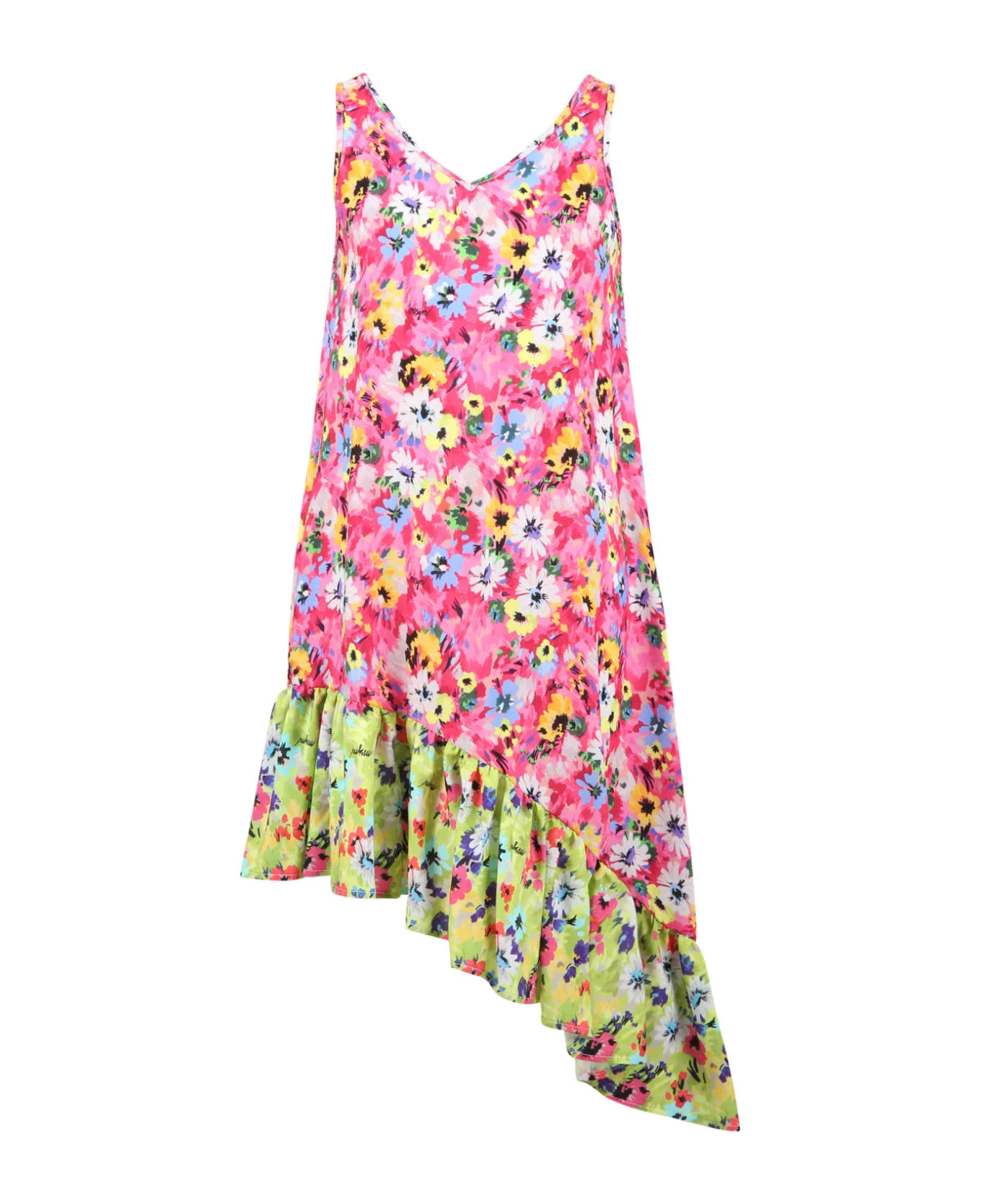 Multicolor sleeveless dress, with shoulder straps and flounces on the bottom, with asymmetrical side. It is embellished with all-over floral print.