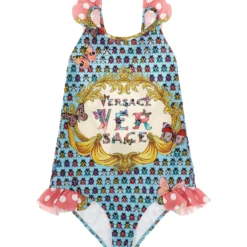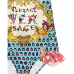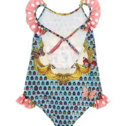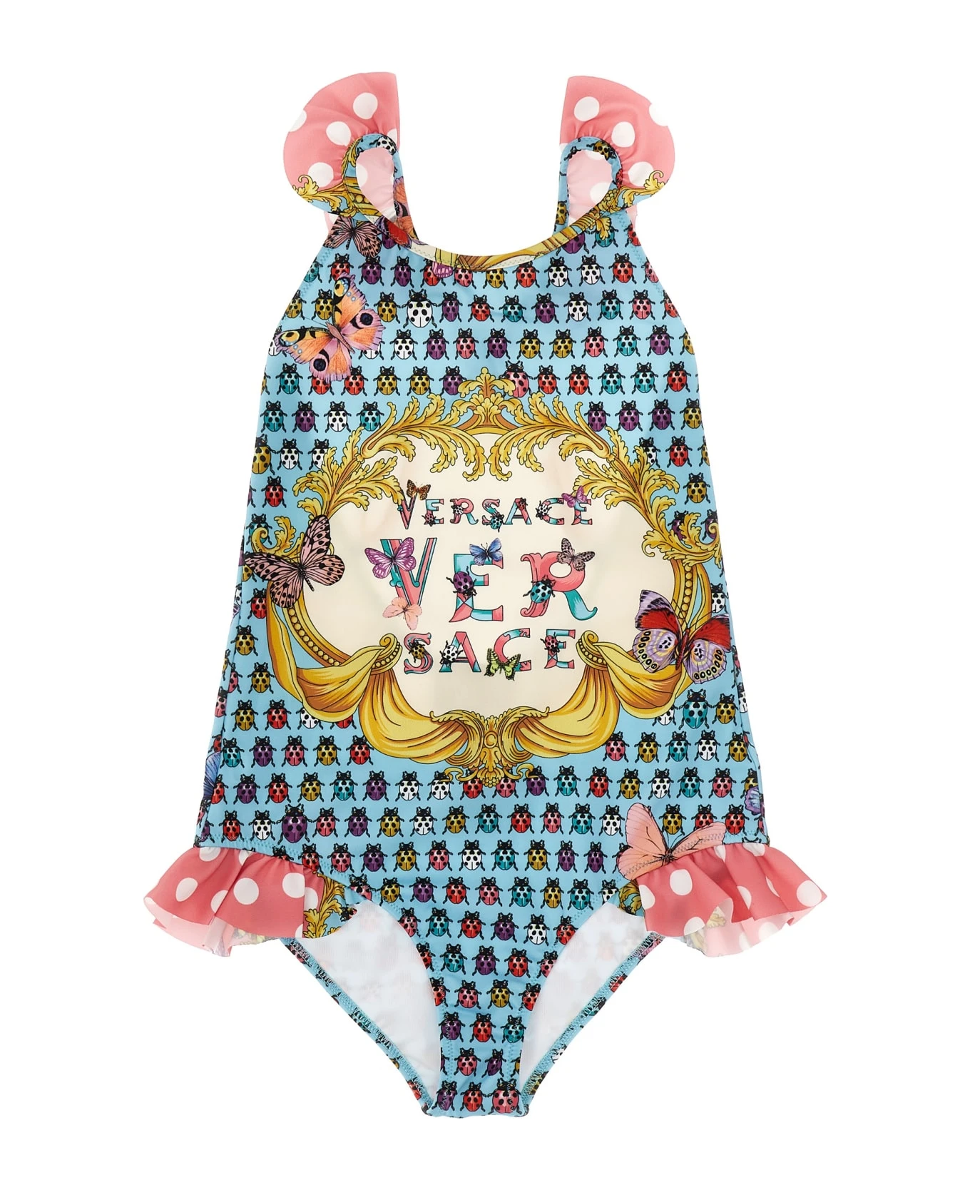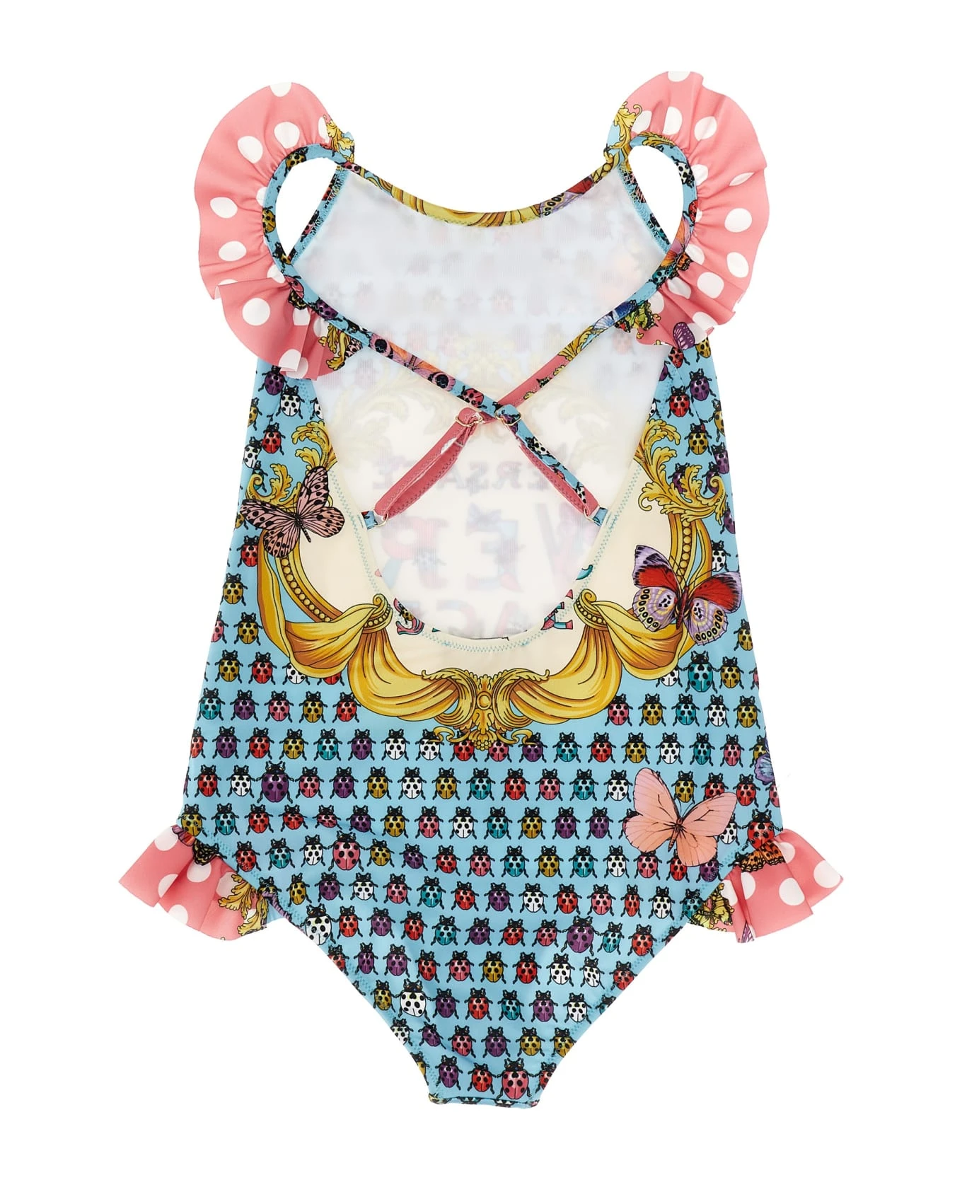 Stretch fabric one-piece swimsuit with ‘Heritage Butterflies and Ladybugs Kids’ print and ruffles on the shoulders.