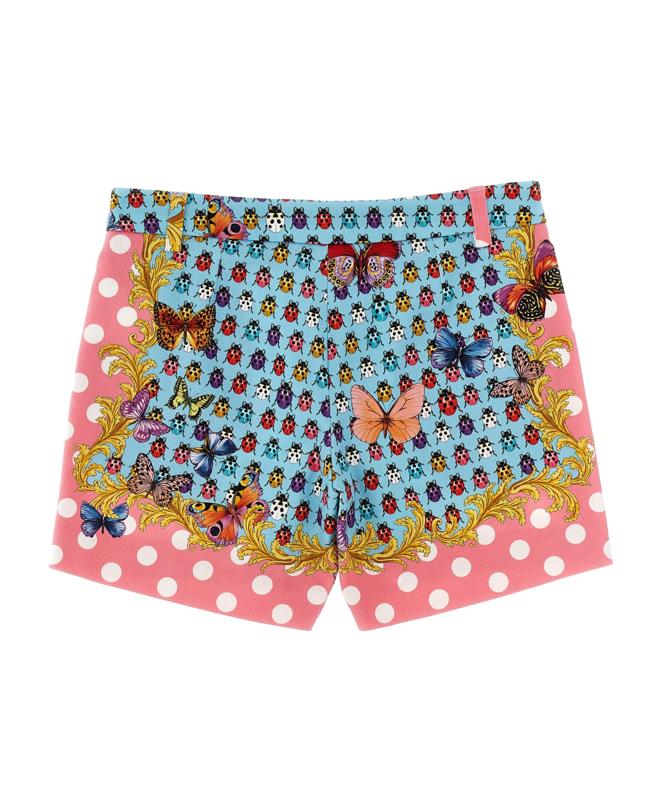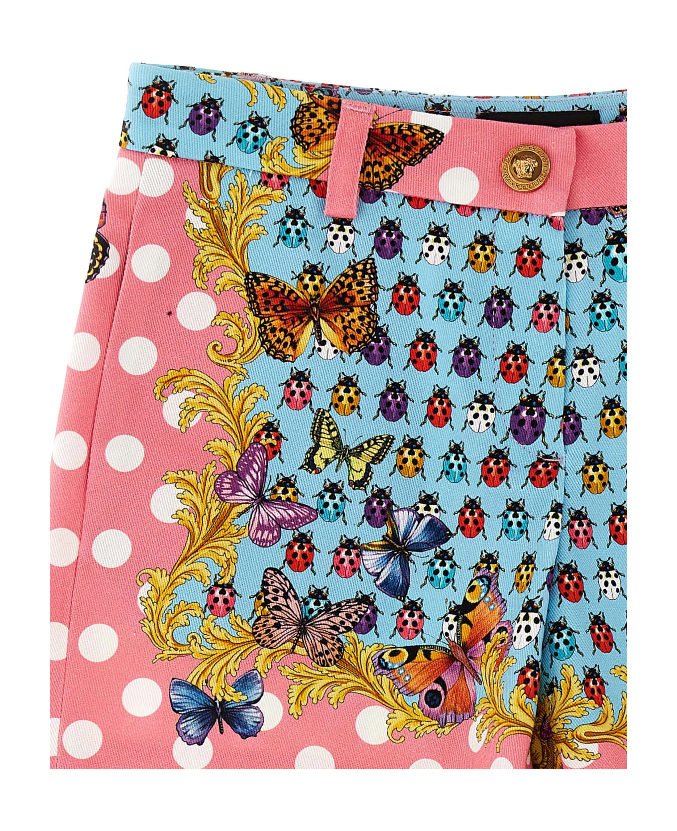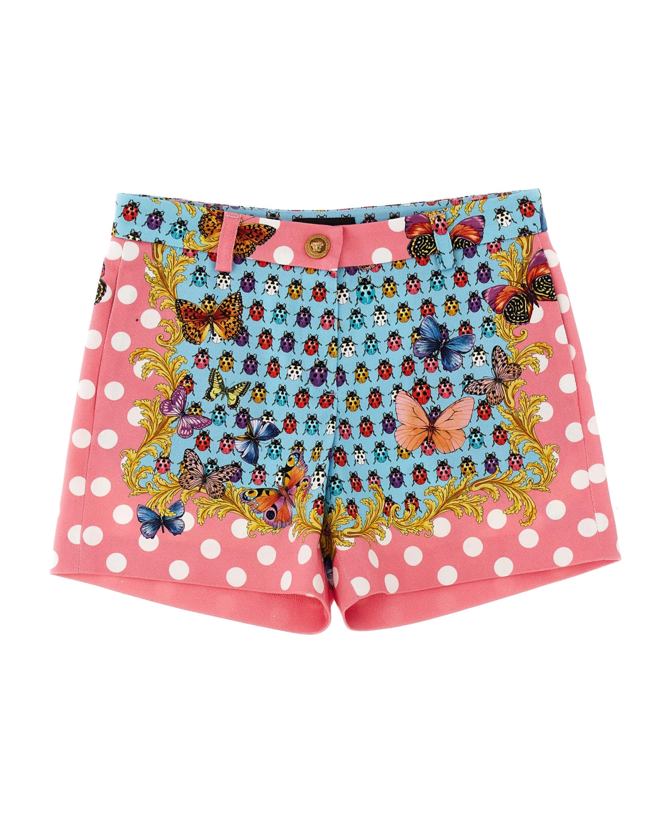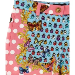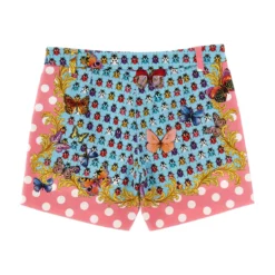 The Holiday in stretch denim capsule shorts with ‘Heritage Butterflies & Ladybugs Kids’ print, Medusa metal elements, pockets, a zip and button closure.